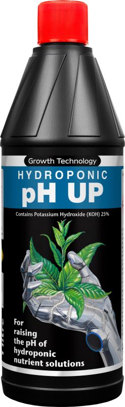 Growth Technology pH Up is a 480 grams/litre solution of potassium hydroxide (KOH) and is very alkaline. It should be handled with extreme care.